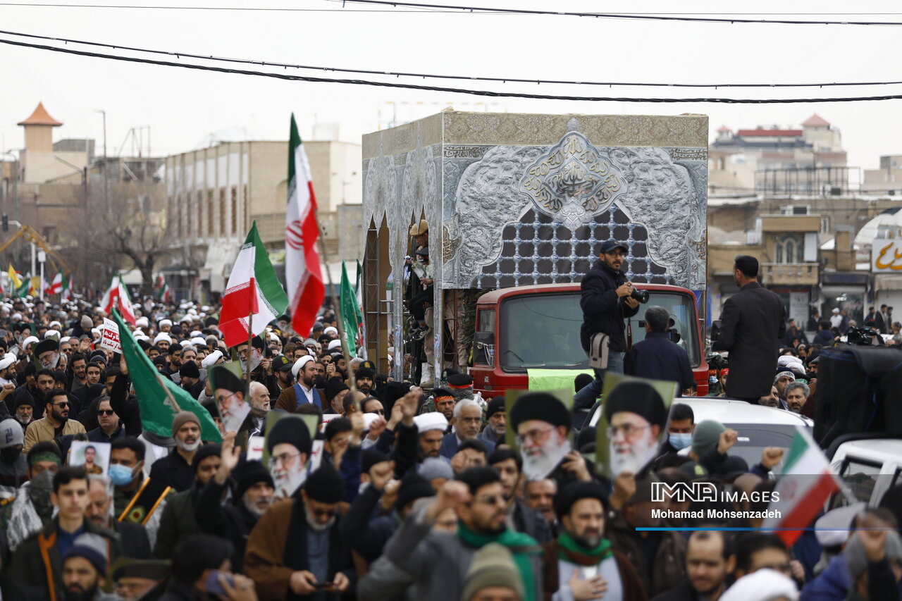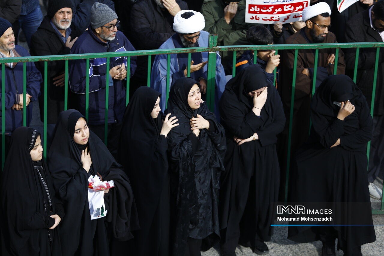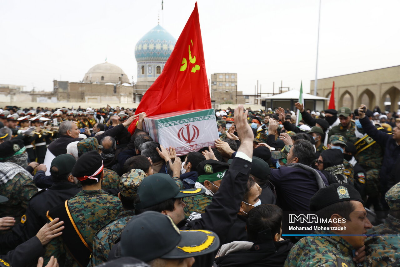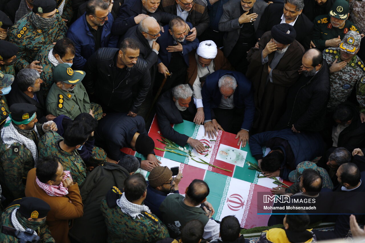 پیکر مطهر دو شهید مدافع امنیت که از نیروی انتظامی غیور استان قم بودند، تا حرم مطهر روی شانه‌های مردم داغدار قم حمل شد.