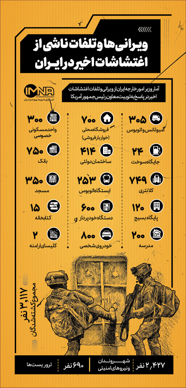 آمار وزیر امور خارجه ایران از ویرانی و تلفات عملیات تروریستی اخیر در پاسخ به معاون رئیسجمهور آمریکا که خطاب به معترضان آمریکایی گفته بود: «برنامهٔ ما بسیار ساده است: اگر به یک کلیسا یورش ببرید یا به یک مأمور فدرال حمله کنید، شما را روانهٔ زندان میکنیم.»