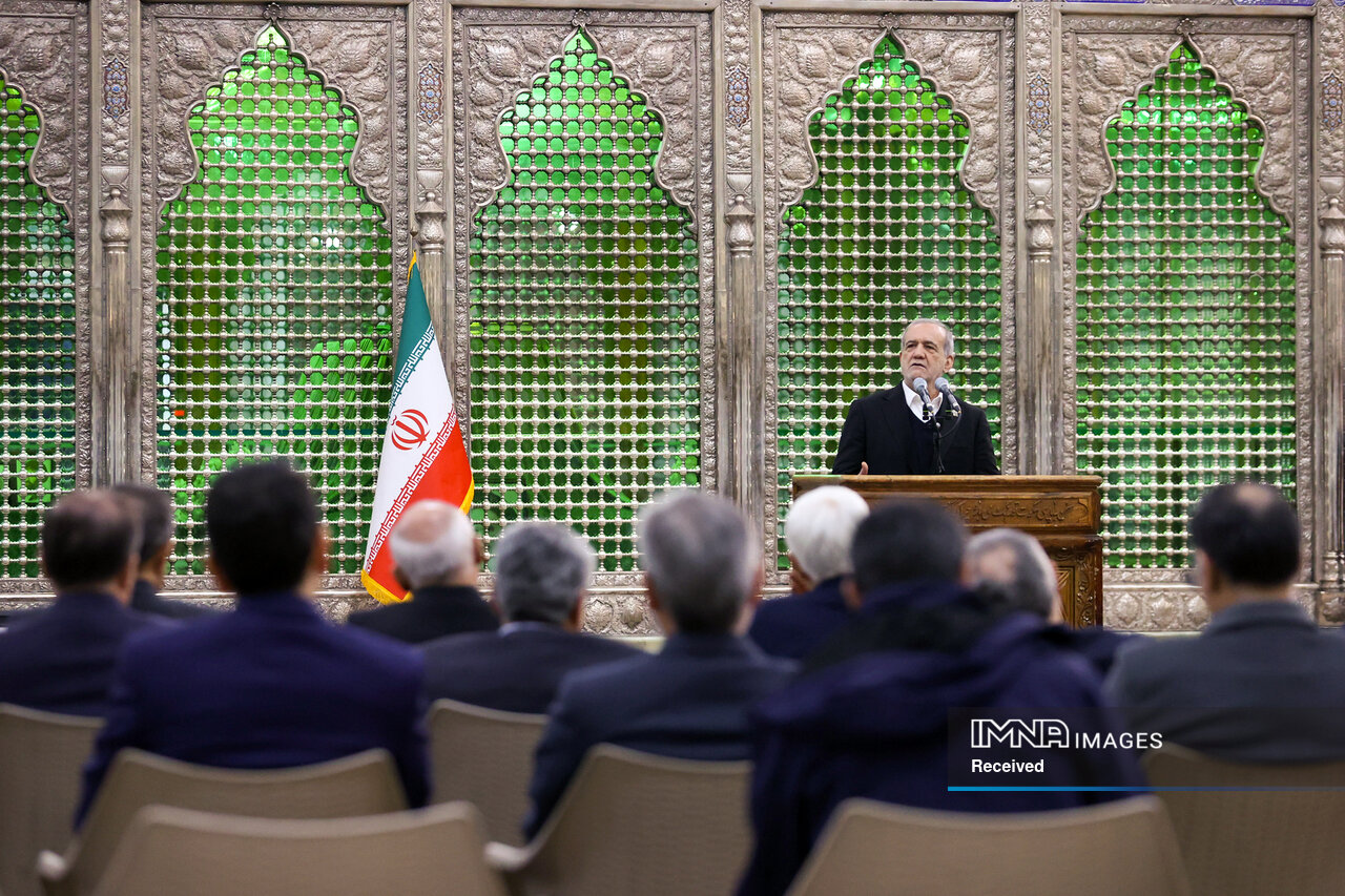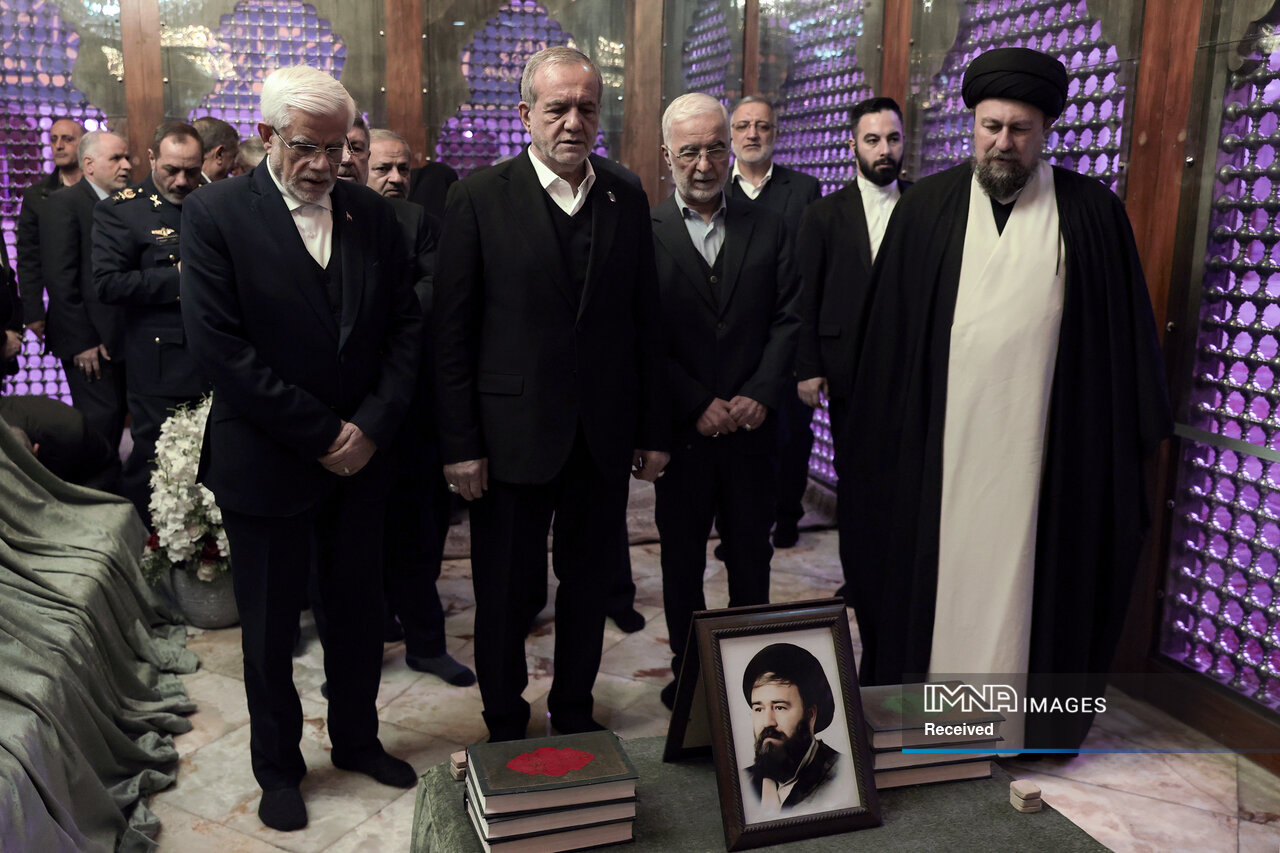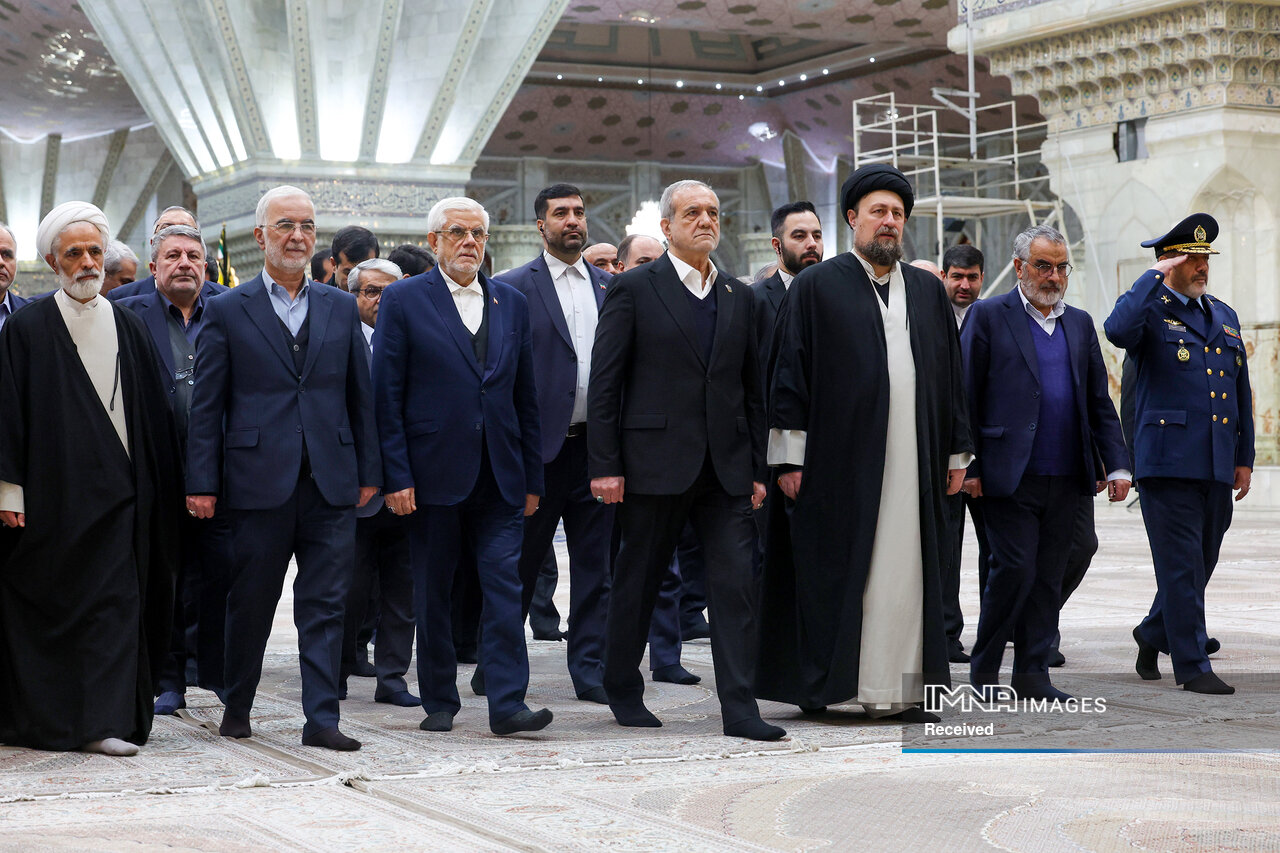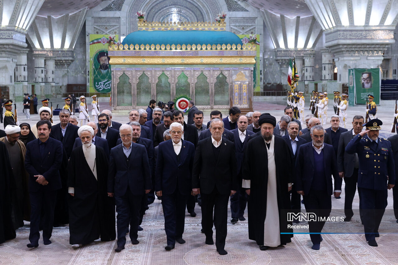 در آستانه سالروز پیروزی انقلاب اسلامی، مسعود پزشکیان، رئیس جمهور و اعضای هیئت دولت، صبح امروز _شنبه یازدهم بهمن_ با حضور در مرقد مطهر امام راحل(ره) و شهدای انقلاب اسلامی با آرمانهای بنیانگذار کبیر جمهوری اسلامی ایران و شهدای انقلاب، تجدید میثاق کردند.